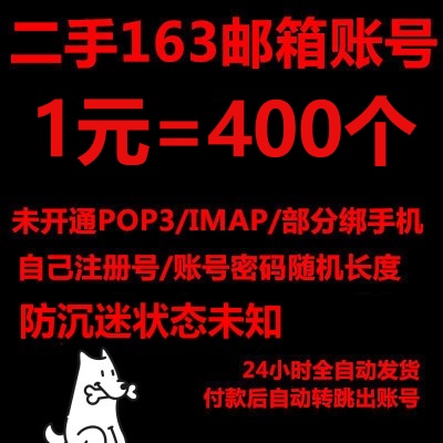 二手163账号----1元400个/未开通pop3/15-19年左右注册/未知绑手机和未知防沉迷的状态/最低购买400个/只包密码正确(不包能登上邮箱)