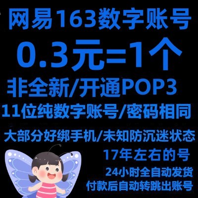 开通POP3----重复上架/适合短期使用/二手手机型163邮箱号/统一密码/11位纯数字账号/大部分绑手机/未知防沉迷