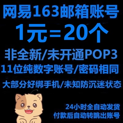 绑定手机/未开通POP3----二手号/随机密码的163邮箱/账号随机长度/适合注册投票等/1元=20个
