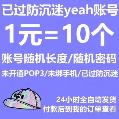 已过防沉迷/未绑手机的yeah邮箱----二手账号/账号随机长度/密码随机长度/未开通POP3/未绑手机/已过防沉迷