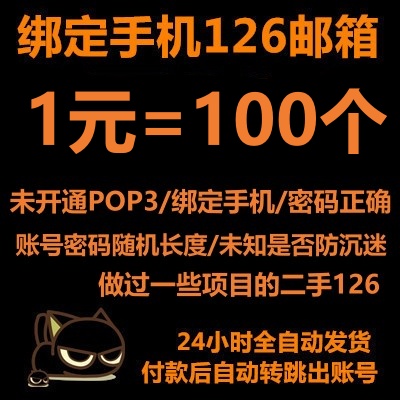 绑手机网易126邮箱/二手号/未开通POP3/绑定手机/密码正确/账号密码随机长度/未知是否防沉迷/账号可能登不上邮箱存在风险