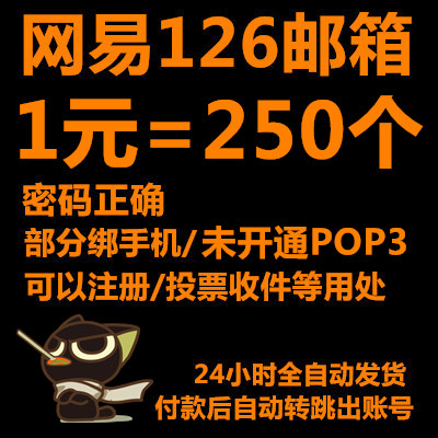 二手邮箱未开通pop3----部分绑手机126邮箱/随机长度/密码正确/1元=250个/最低购买250个/只包密码正确(不包能登上邮箱)