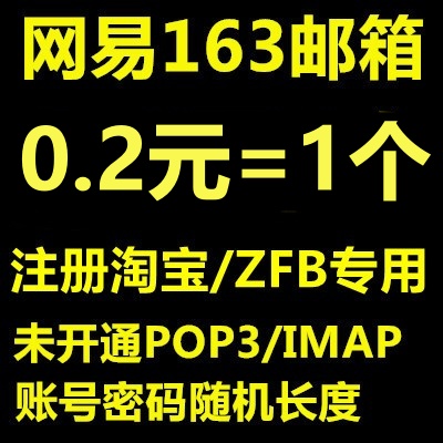 注册淘宝专用163账号/未开通POP/账号密码随机长/0.2元/个